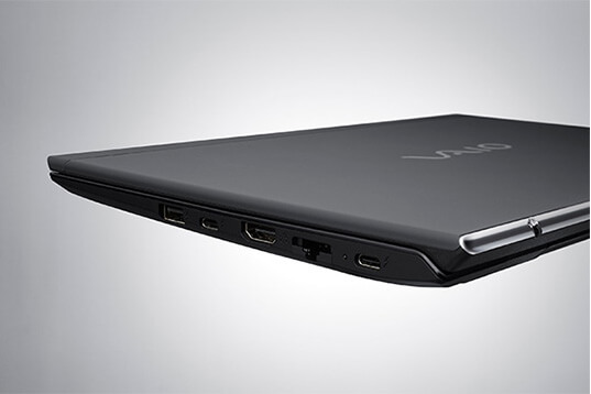 VAIO特殊的下沉式转轴设计,将键盘面抬起一定角度,给用户更舒适的打字体验,不仅是减轻手腕的负担,侧面端口也是让用户轻松拔插的设计。